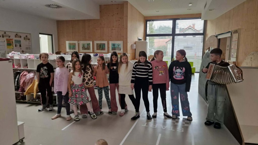 Naši učenci so petkov dan (21. 11.) pričeli z značilnim zajtrkom: kruh, maslo, med, mleko in jabolko. Vse sestavine so bile lokalnega izvora, kar dodatno poudarja pomen podpore okoliškim kmetom in čebelarjem. Po koncu pouka smo učiteljice RaP-a v jedilnici šole organizirale program za učence razredne stopnje. Ob zvokih harmonike šestošolca Tila Kuzmana je skupina učenk zapela Slakovega Čebelarja. Nato je vse prisotne v jedilnici nagovoril naš izbrani gost. Gostili smo domačina, nekdanjega zelo uspešnega učenca naše šole, danes doktorja znanosti in kmetovalca, gospoda Simona Klančnika. Z zanimivim in nazornim predavanjem je v pogovoru z učenci predstavil domače kmetijske dejavnosti in vseskozi opozarjal na pomen lokalno pridelane hrane. Sledile so različne dejavnosti po razredih. Izbrana skupina učenk 3. in 4. razreda je skupaj s harmonikarjem Tilom izvajala Slakovo pesem še v razredih predmetne stopnje. Odšli so tudi na obisk v sosednji vrtec, kjer so se jih zelo razveselili in bili nad izvedeno pevsko točko zelo navdušeni. Aktivnosti, vezane na TSZ pa smo zaključili s pokušino domačih medenjakov.