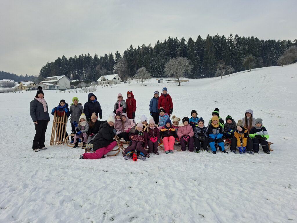 V četrtek, 15. 1. 2026, so prvošolci in četrtošolci uživali v zimskem športnem dnevu, ki je bil namenjen sankanju. Po malici v šoli smo se peš odpravili proti bližnjemu hribu Podgorja, kjer so se učenci z navdušenjem spuščali po zasneženih strminah.